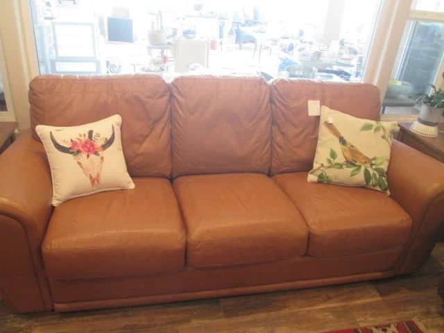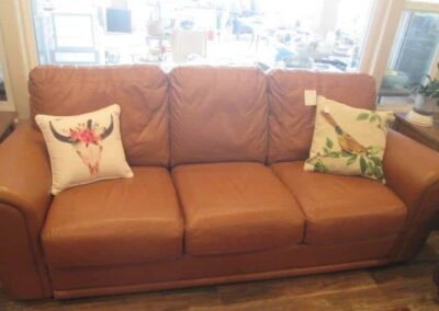 - Tan leather sofa & loveseat, mission-style saddle-brown leather recliner